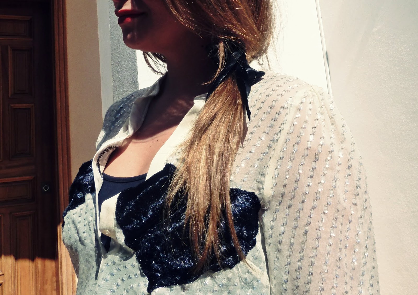 En el pelo llevo una cola hecha a un lado con efecto despeinado (mejor dicho despeinada sin ningún efecto) y es una solución perfecta para cuando la melena no está recién peinada y necesitamos domarla de forma diferente.