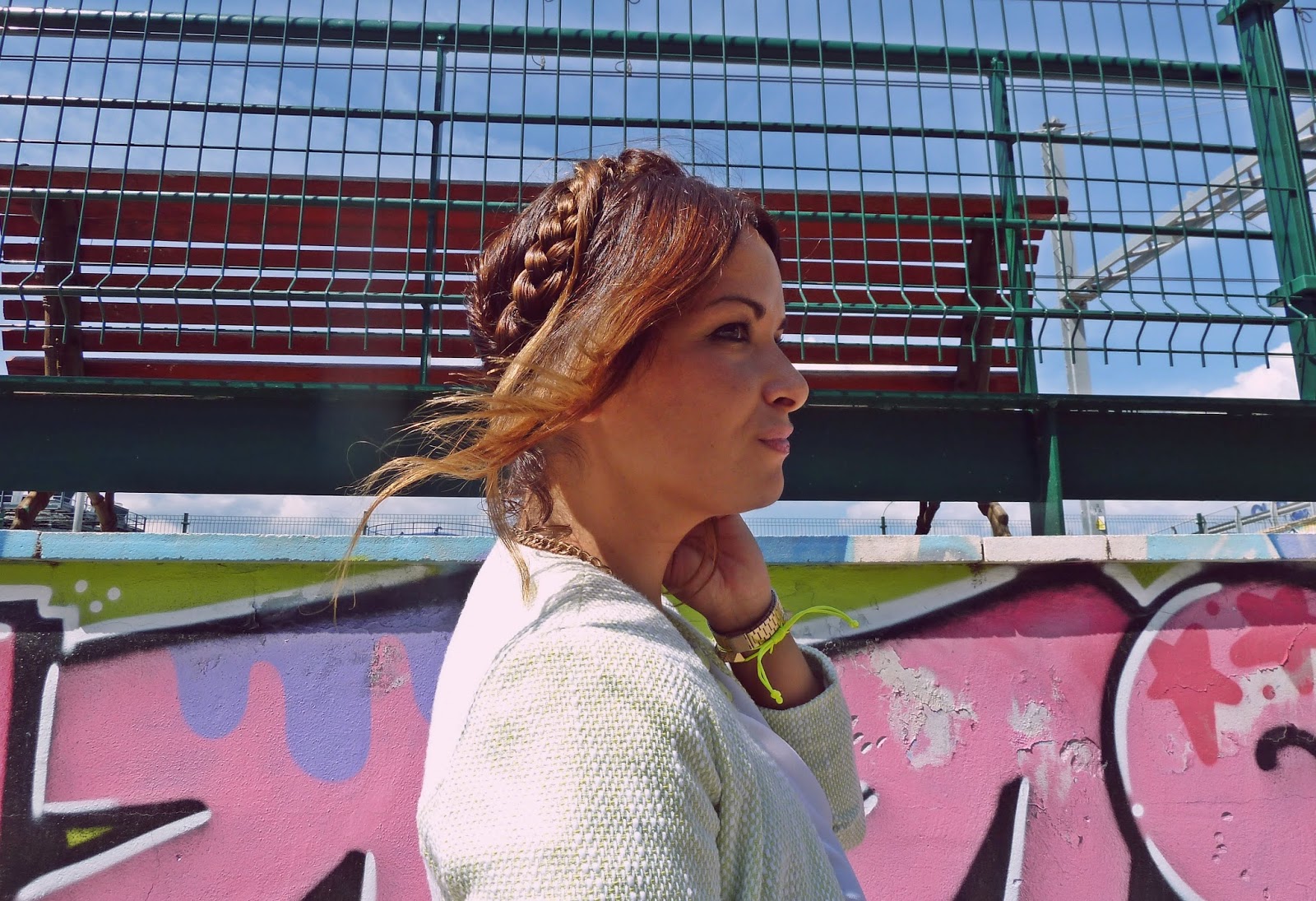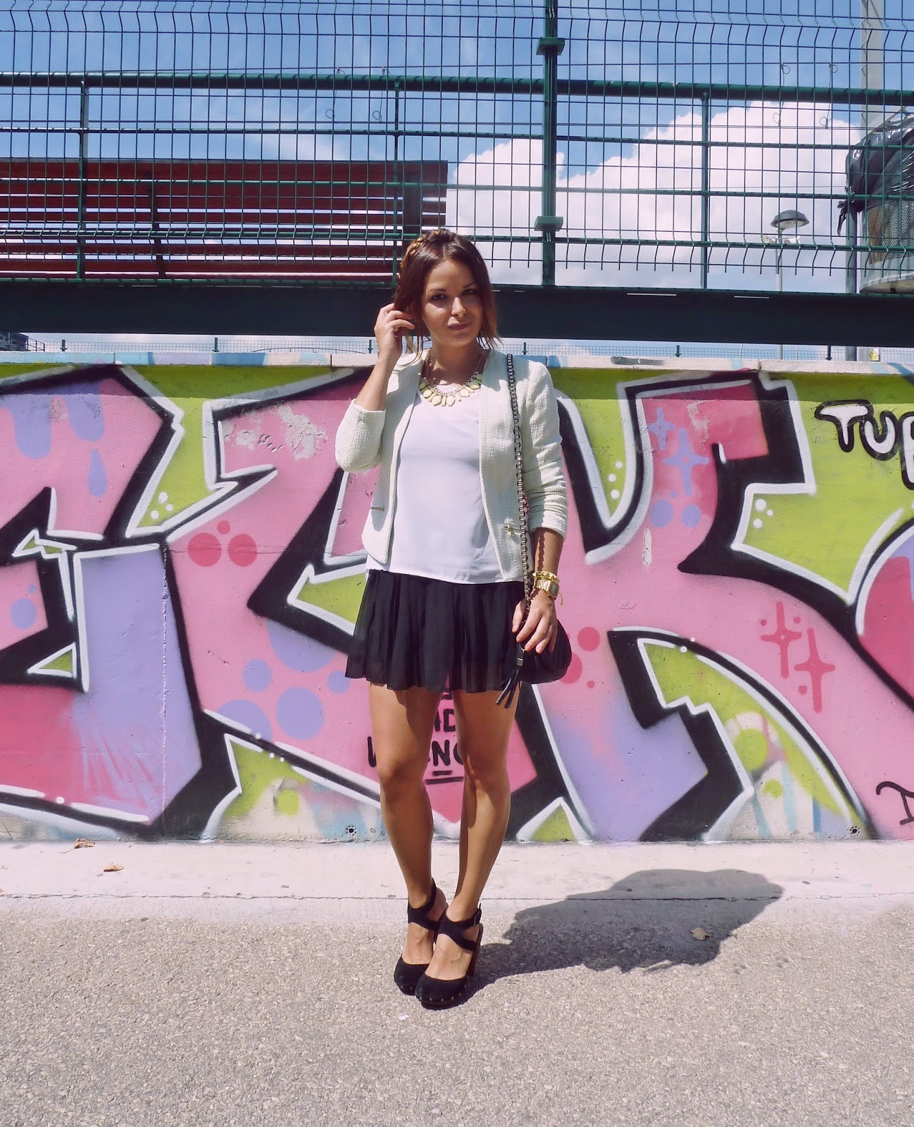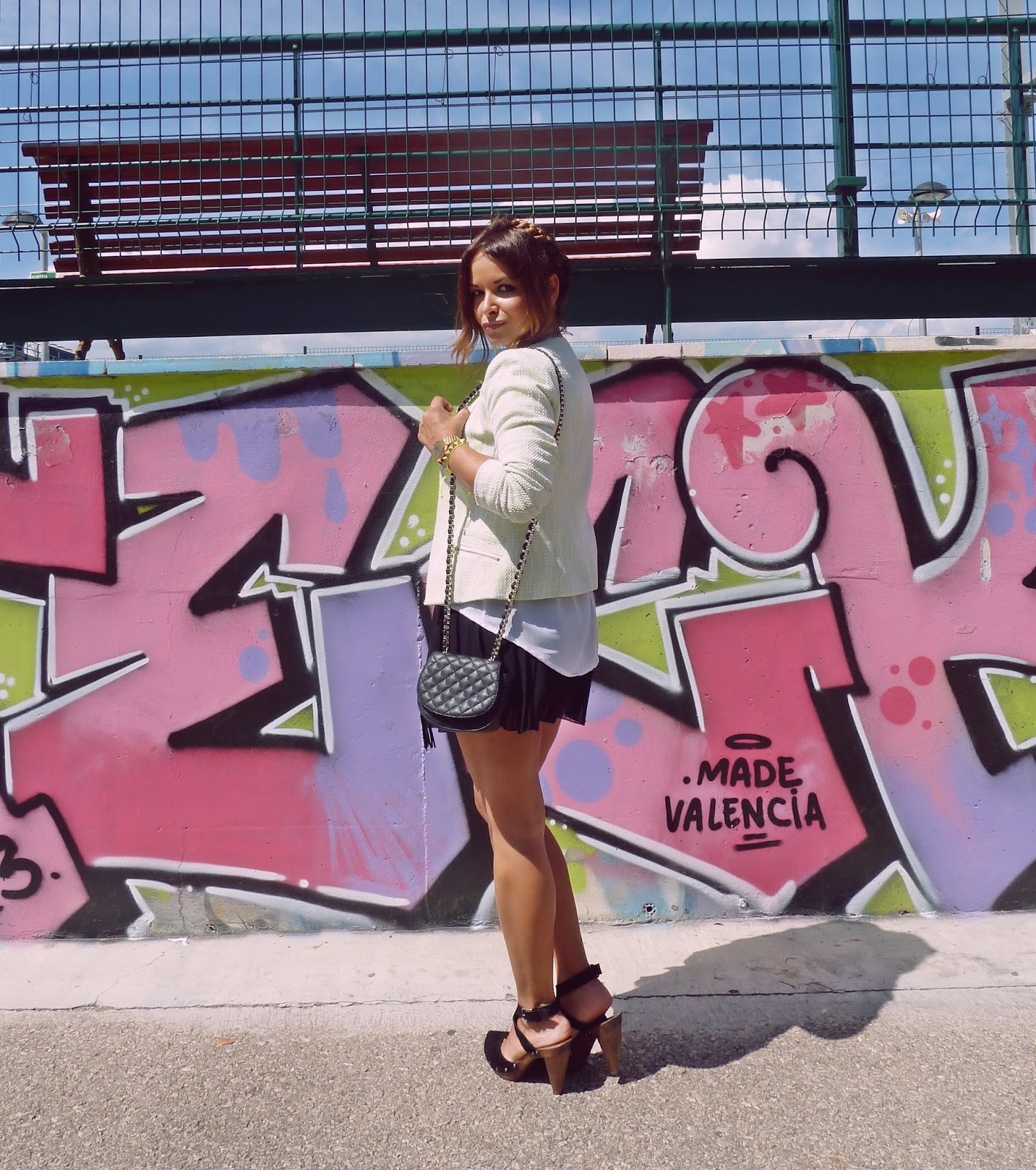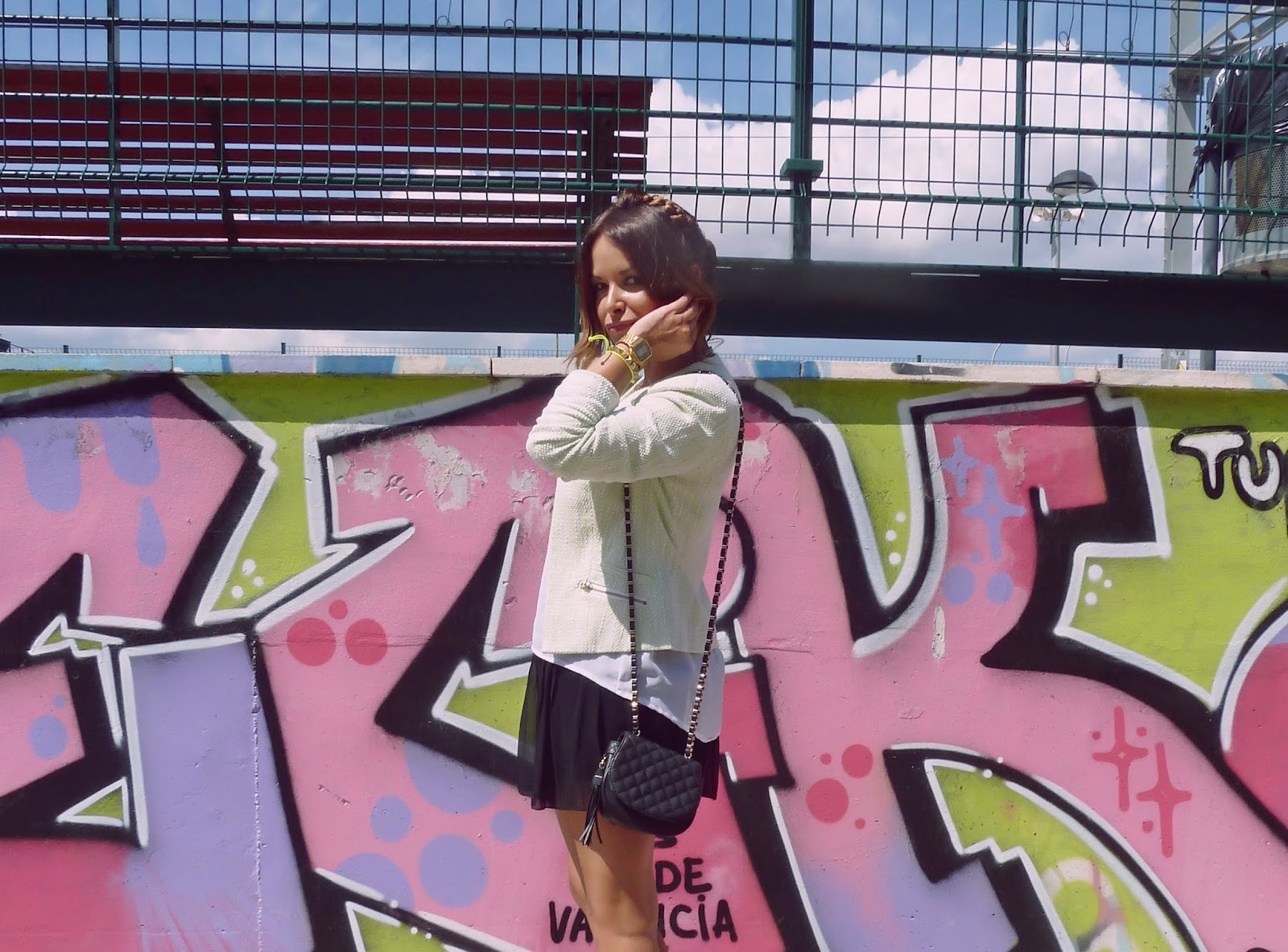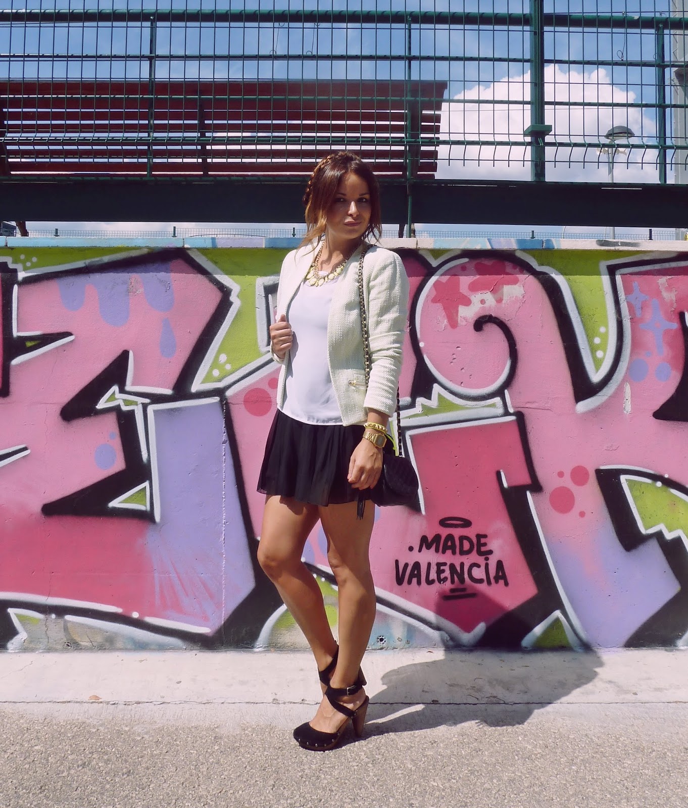 En esta ocasión, he combinado la chaqueta con una falda de tablas y una simple blusa blanca, zuecos y bolsito también con cierto aire «Chanel» y una gargantilla en amarillo flúor.
