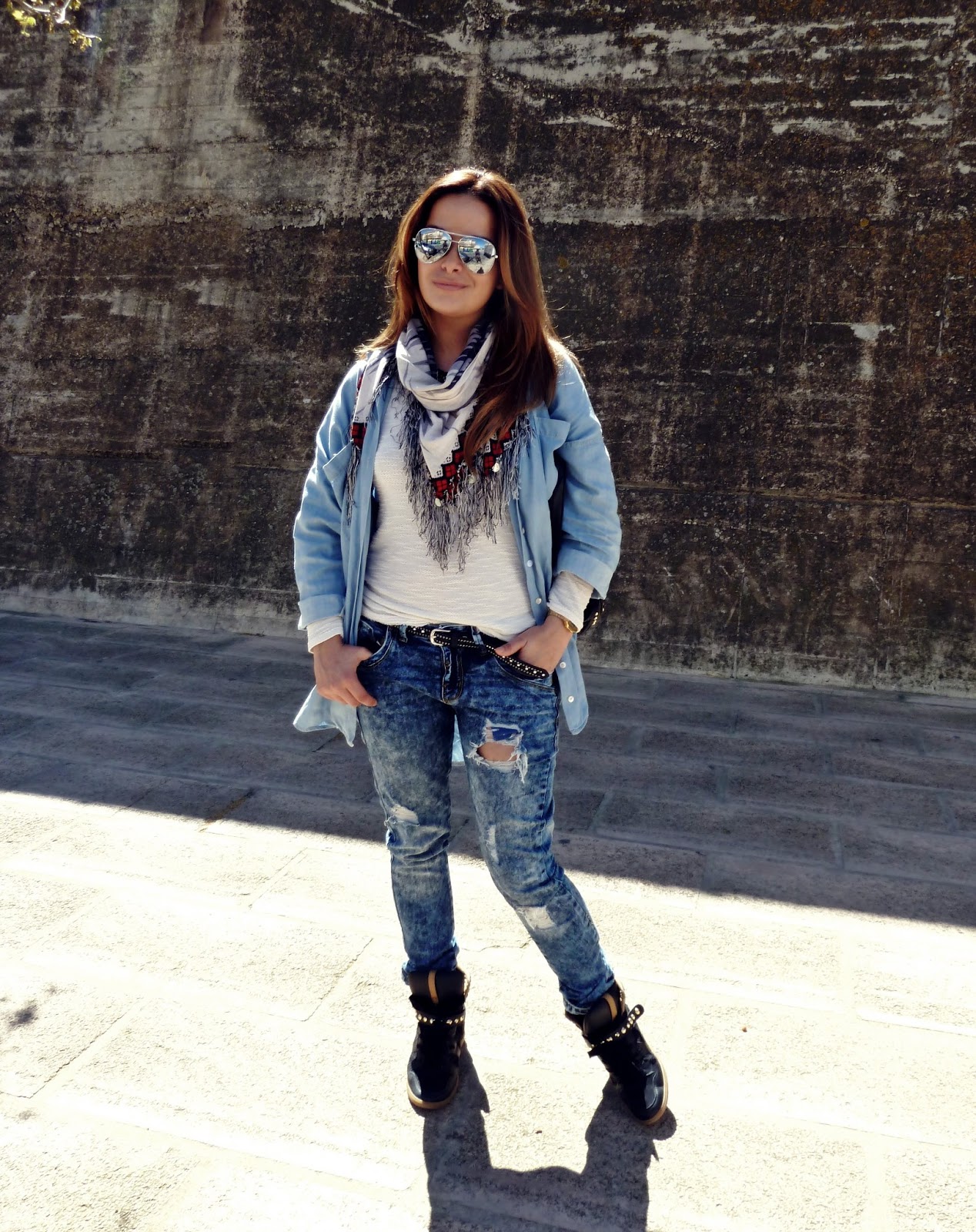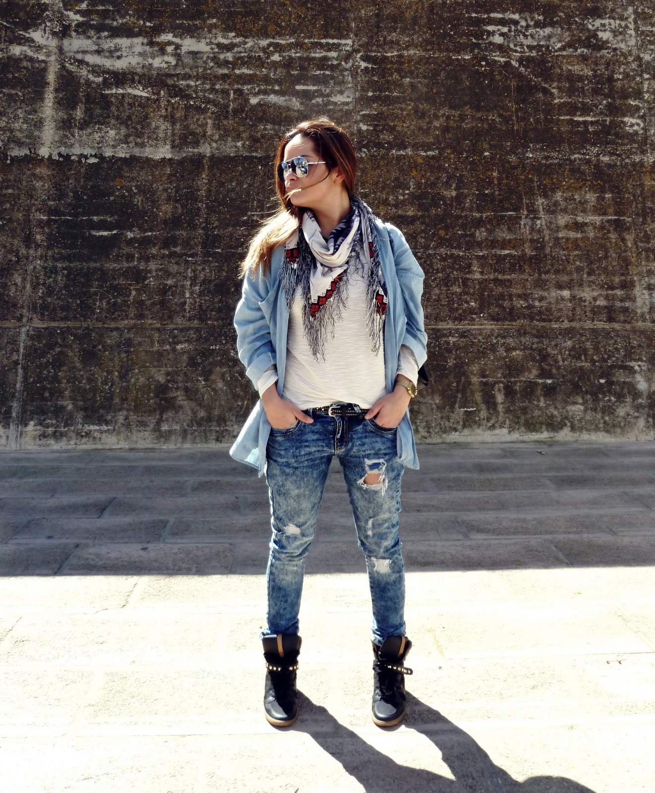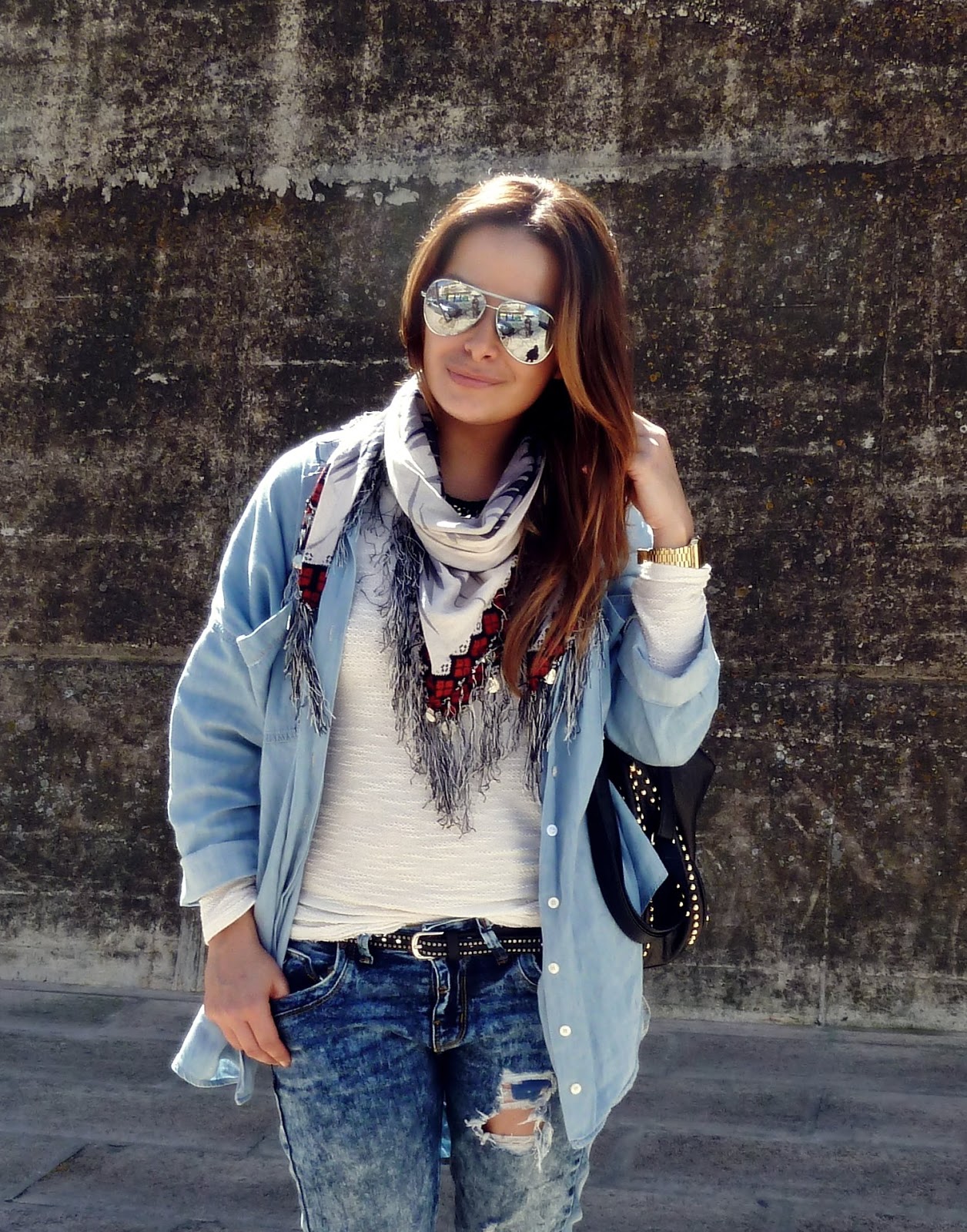 Este pañuelo lo he rescatado de una caja de las prendas que no me pongo pero de las que tampoco me quiero deshacer, tendrá como cuatro o cinco años, lo compré porque el estilo navajo me gusta, aunque en ese entonces no era tendencia. Lo que ocurre es que me he llegado a saturar de ver prendas de este estilo en las tiendas y la verdad que no me he comprado nada «navajo»desde el famoso jersey en tonos pastel de MANGO que tan famoso se hizo la temporada pasada y el cual, por cierto, tengo que sacar para ponérmelo ya, hay que aprovecharlo!