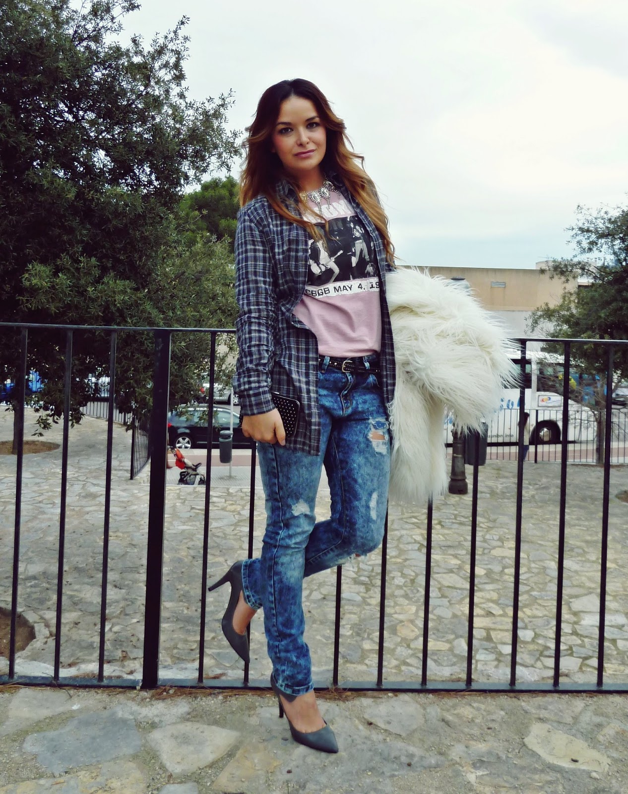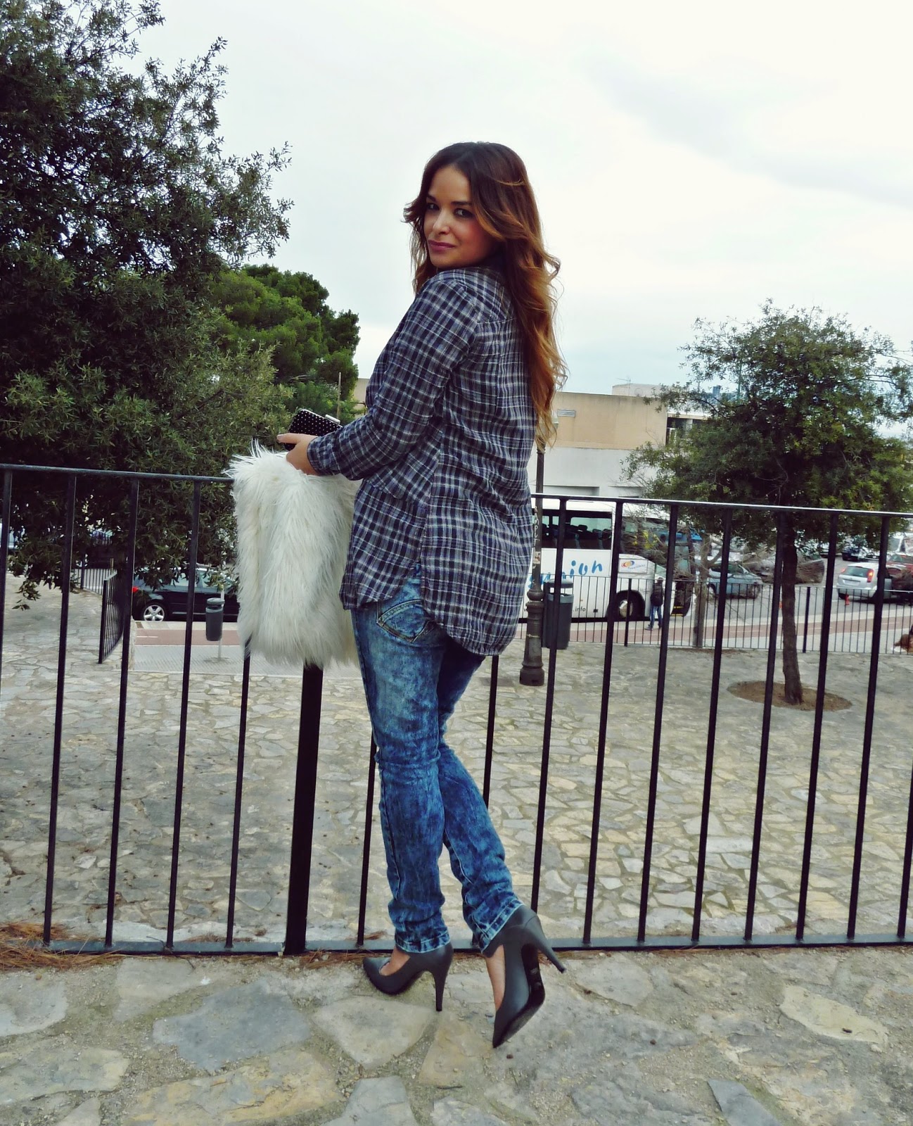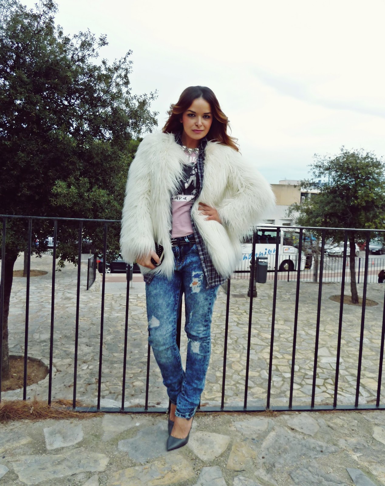 En este caso, cambié la cazadora de cuero por este abrigo de pelo sintético, las sneakers por un salón con taconazo y el maxi bolso por un clutch.