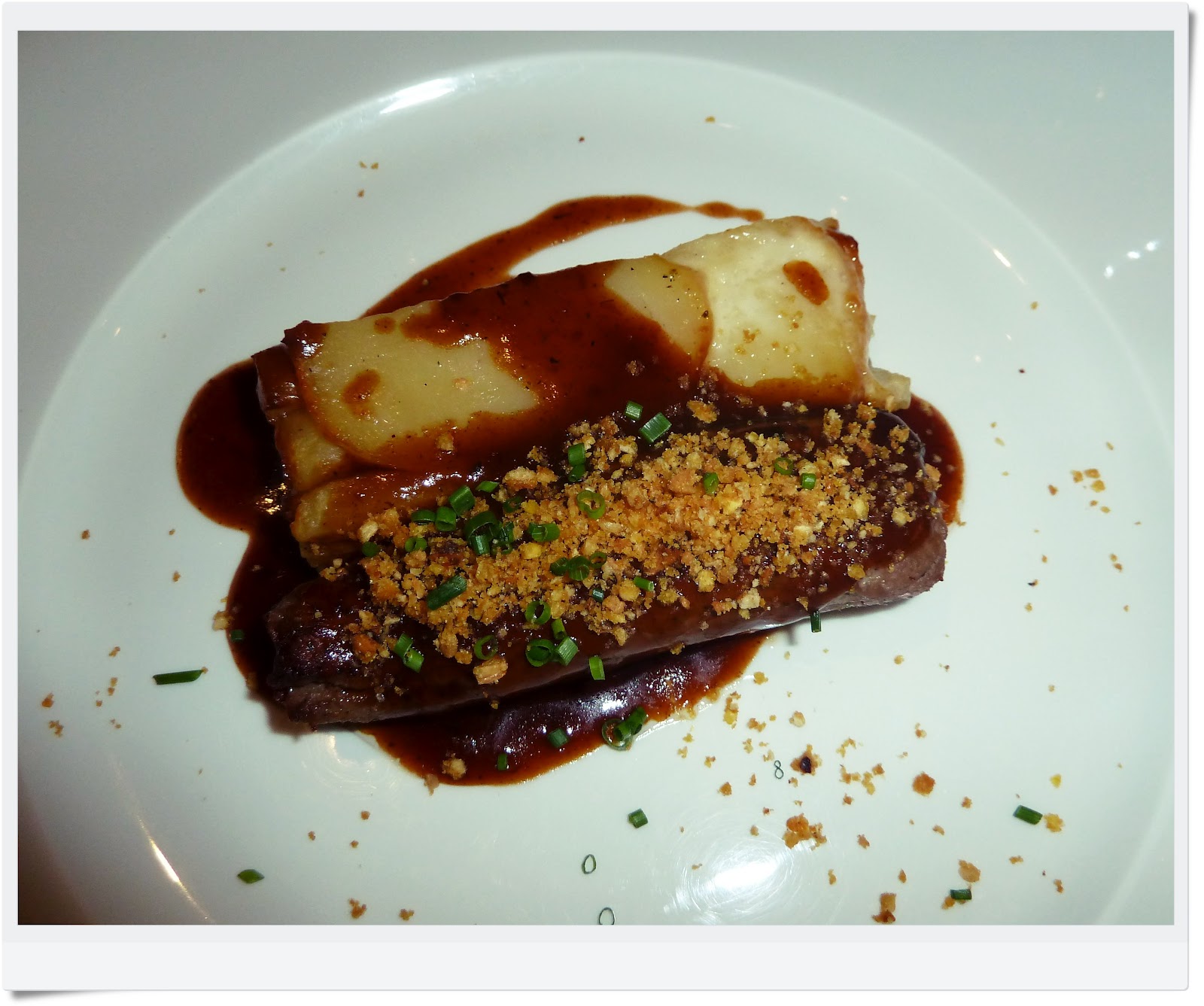Y como segundo plato, pato con una salsa barbacoa muy ligera (me encantó y normalmente me parecen muy empalagosas) espolvoreado con crocanti de kikos por encima y acompañado con patatas al horno.