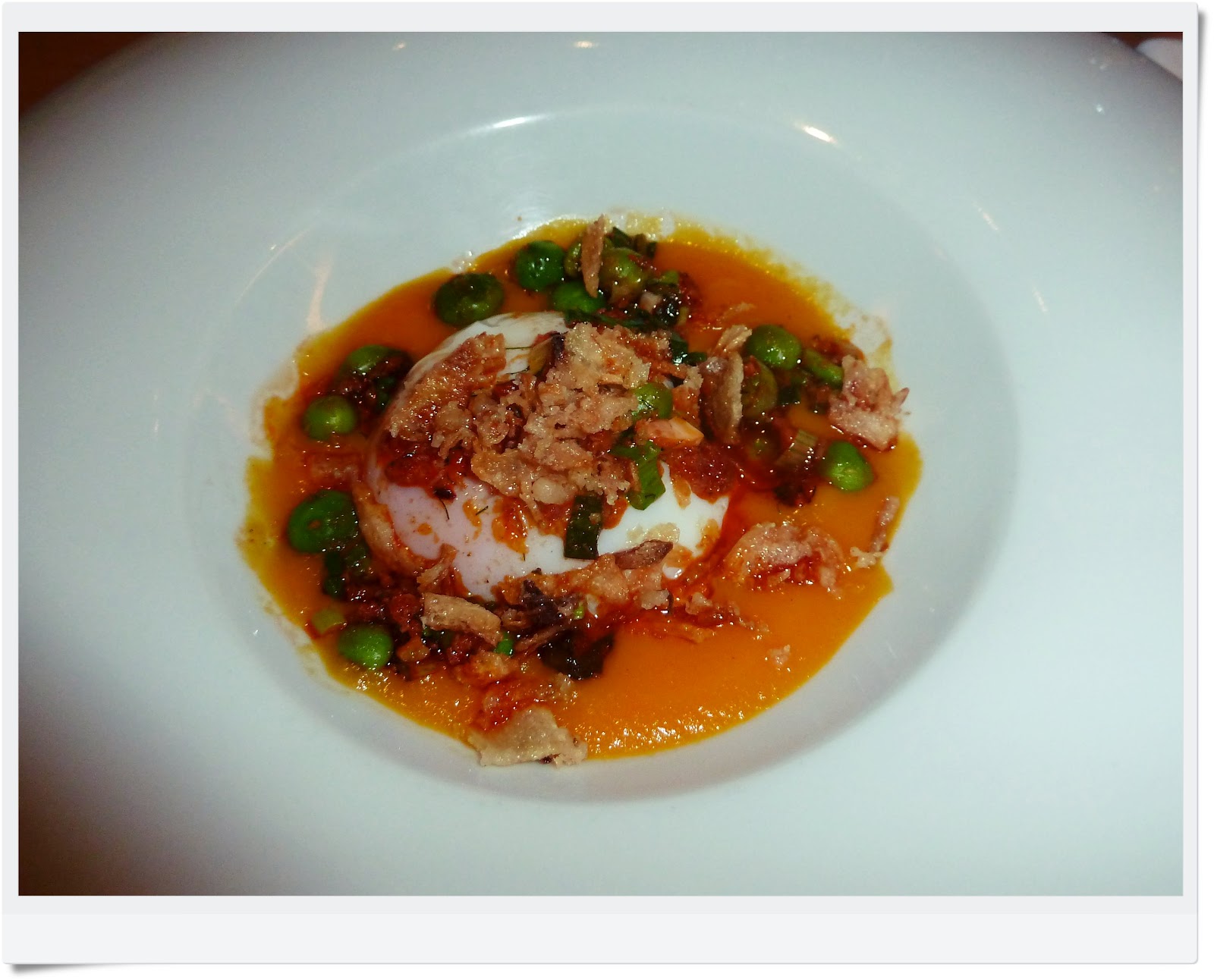 Segundo entrante: huevo cocido a alta temperatura al estilo de Sóller, con guisantes y sobrasada. La textura impresionante, del sabor ni os cuento…