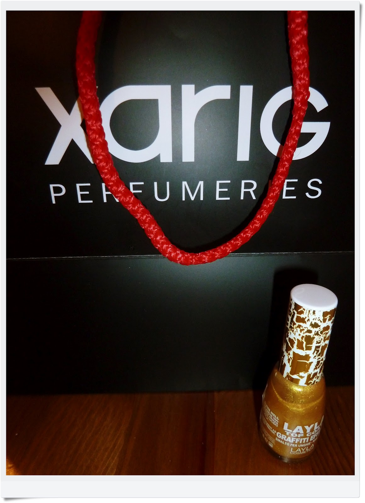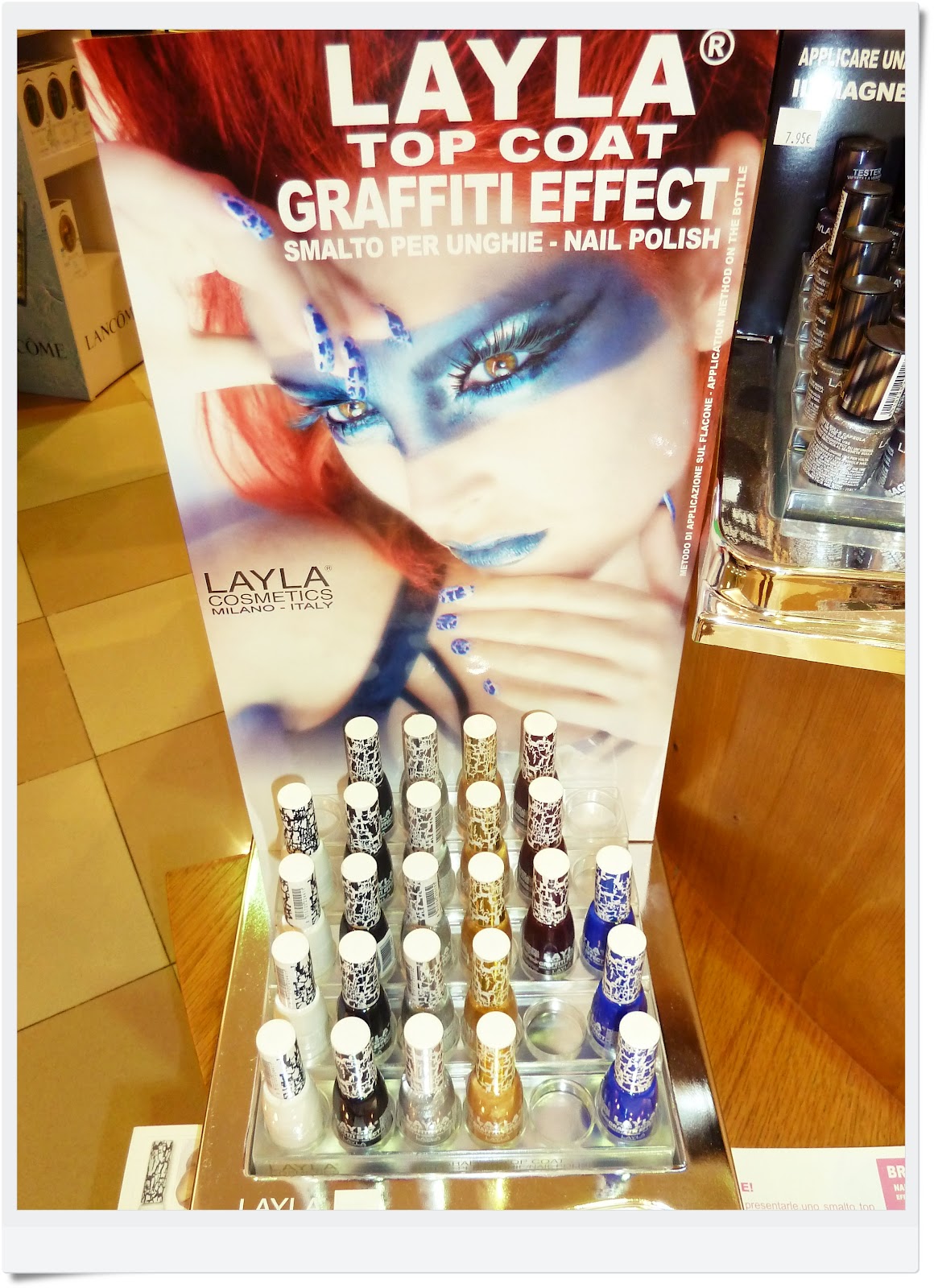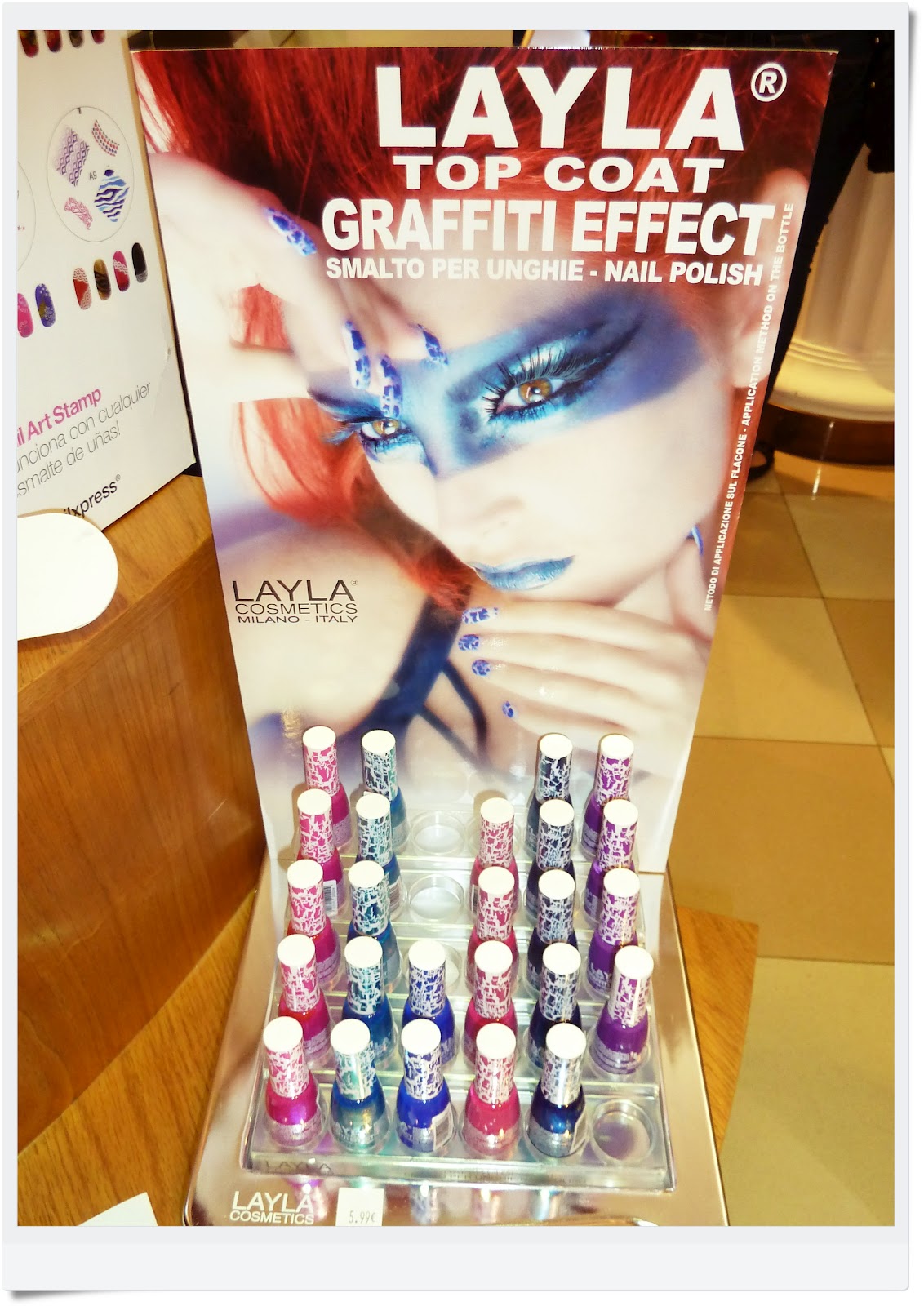 Y sin olvidar las uñas, donde nos mostraron el nuevo maquillaje efecto GRAFFITI EFFECT de LAYLA, laca de uñas que me compré en dorado para combinar con morado (las uñas quedan como el tapón del envase)