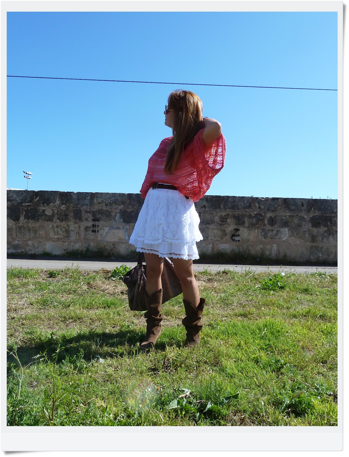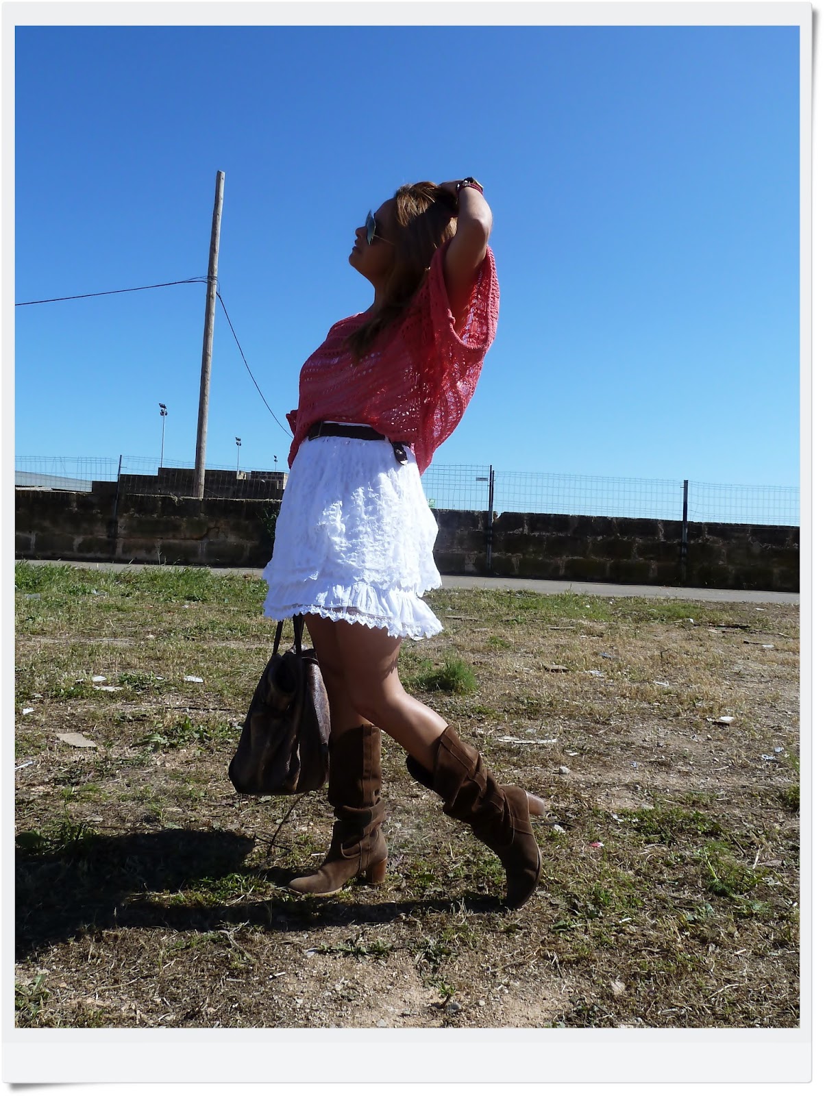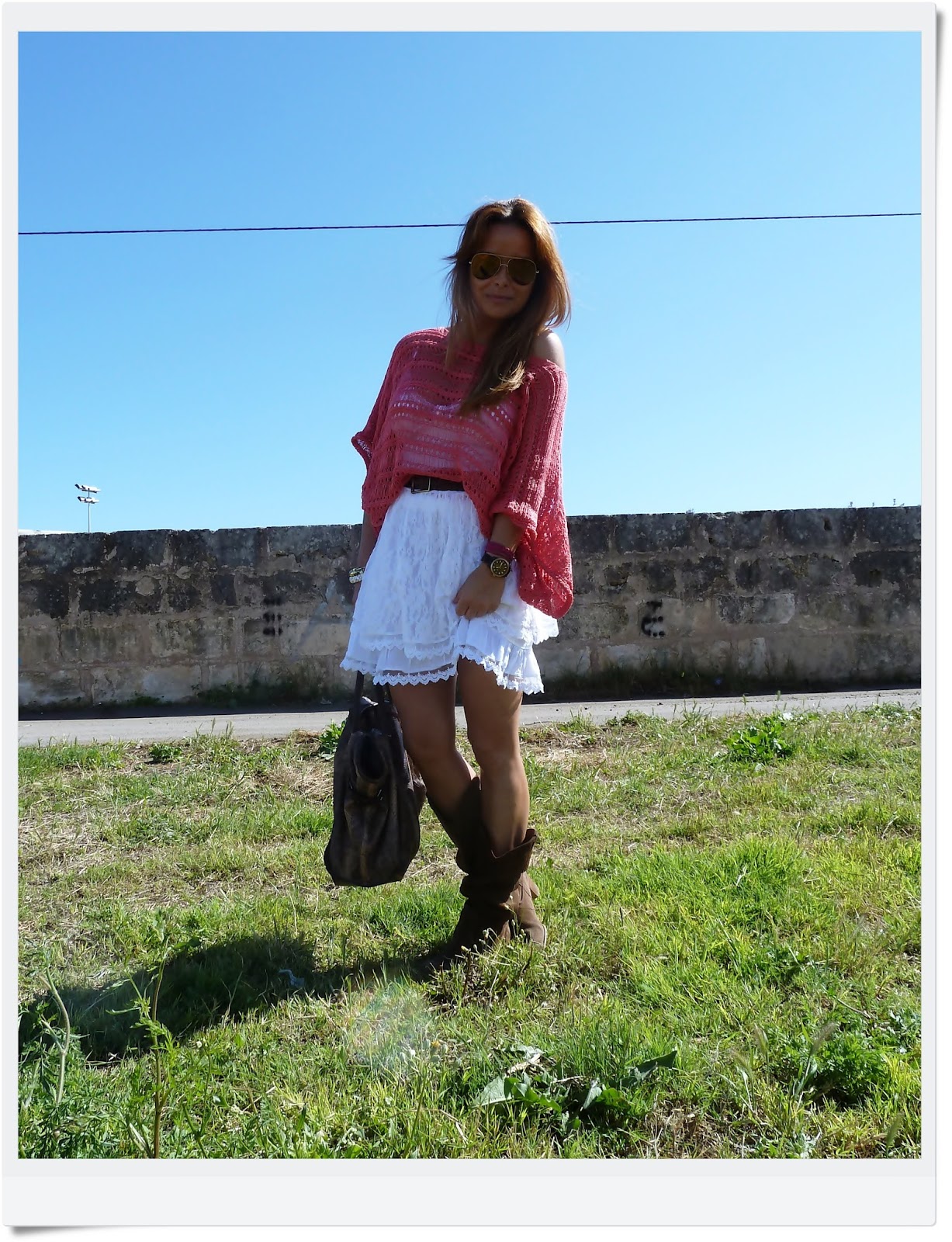 Aquí en las islas, este tipo de ropa rollo ibicenco, como la falda, son habituales en cuanto llega el buen tiempo, tanto si son tendencia como sino y por mi parte, me encantan. Cada temporada me hago con alguna prenda de este estilo. Para darle un toque más actual, lo he combinado con un jersey color fresa y he aprovechado, ya que son pocos días en los que se puede utilizar esta combinación de vestidito/falda + botas en Mallorca, aquí pasamos del frío al calor sin darnos cuenta y por mucho que en Ibiza lo lleven en pleno agosto, que queréis que os diga, a mí en breve se me cuecen los pies.