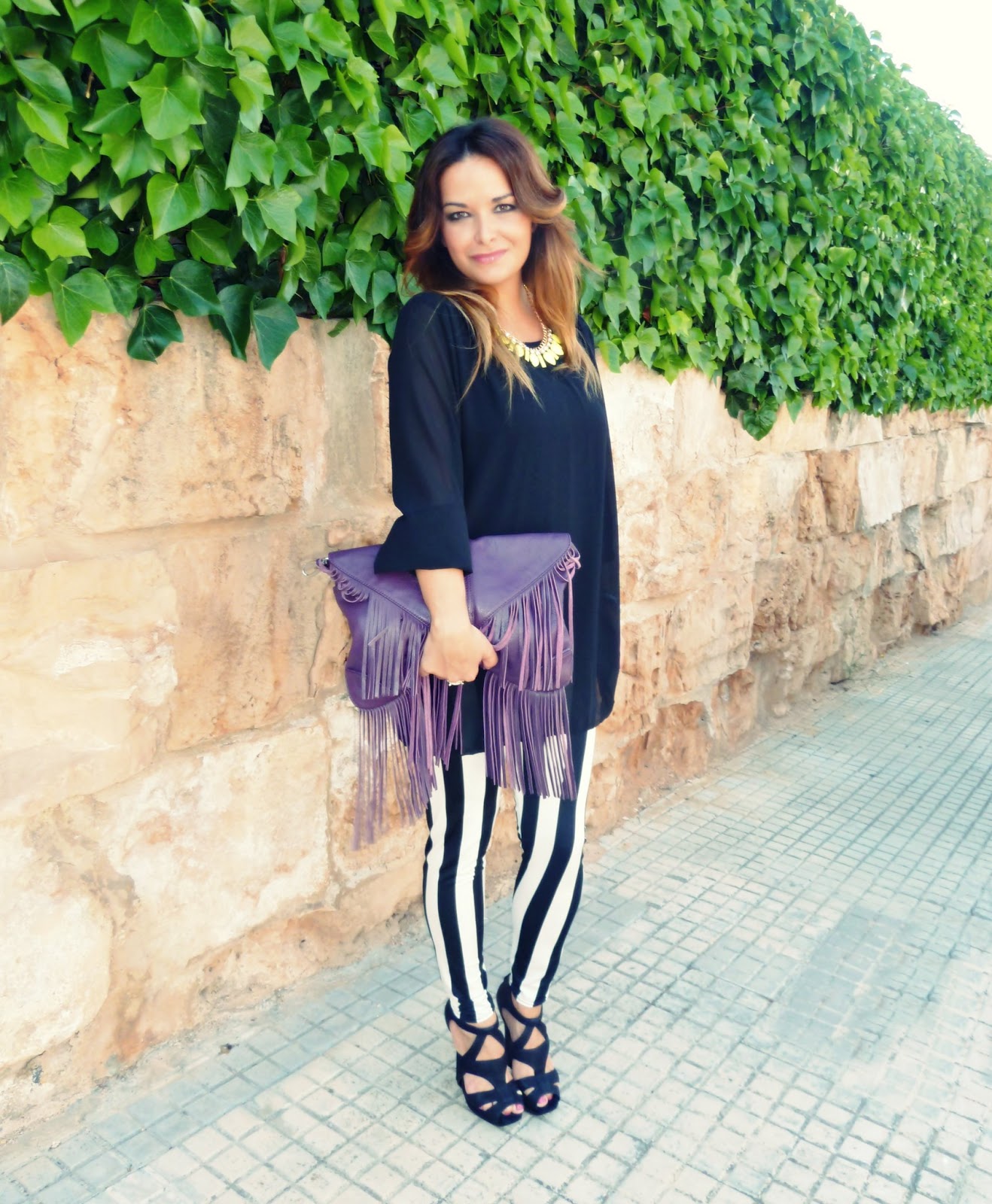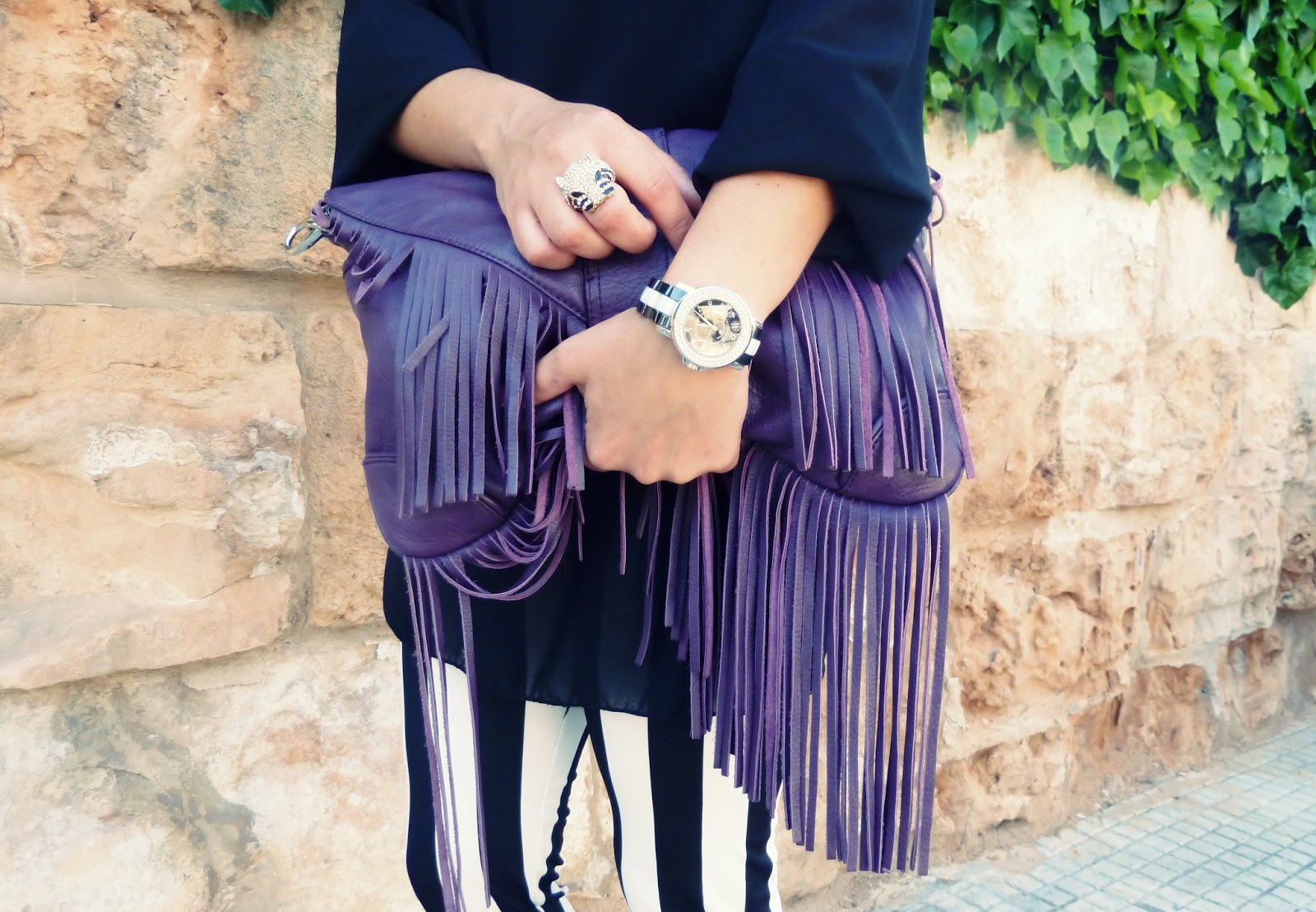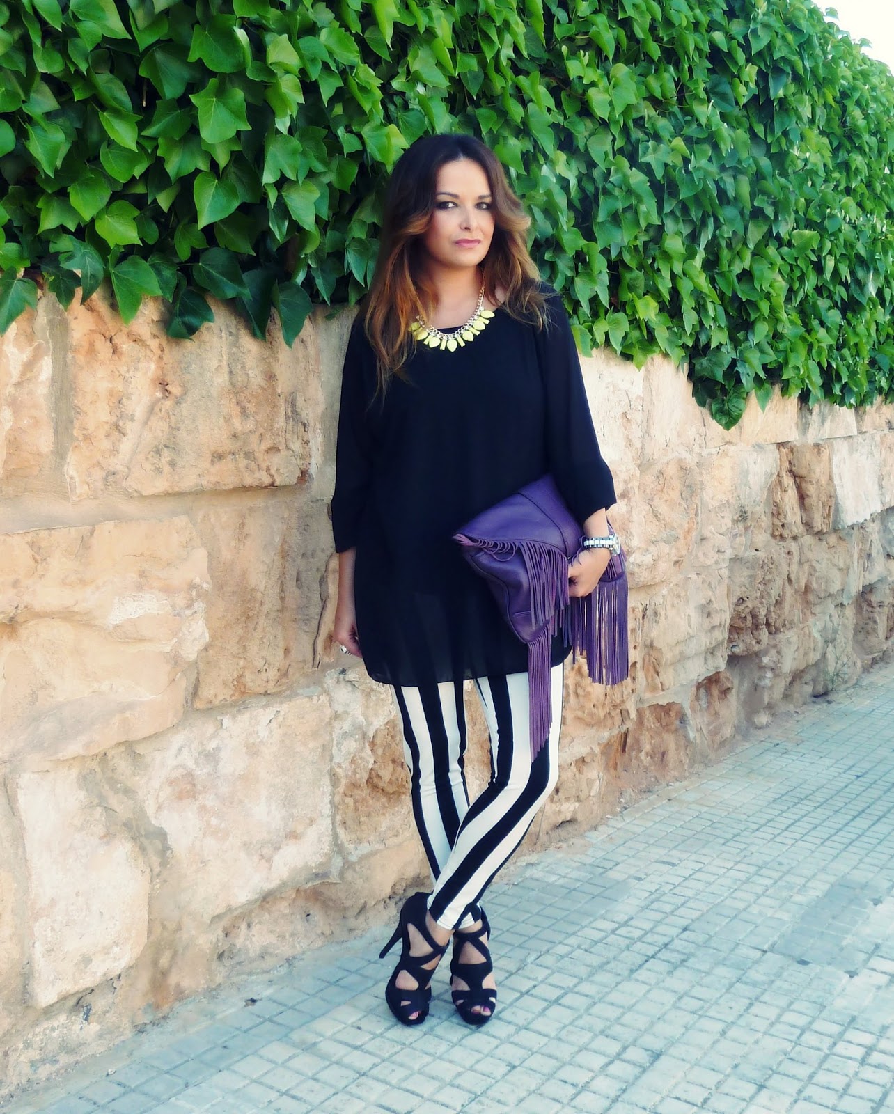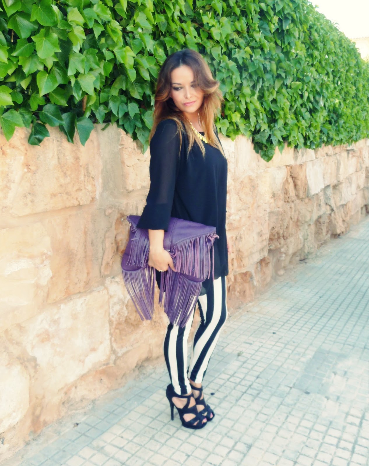 El bolso ya estaréis cansadas de verlo por aquí, el print rayas en blanco y negro que tan de moda está, me encanta como queda combinado con morado. De hecho, tengo que encontrar una falda en este tono para combinar con la camisa de rayas de Bershka.