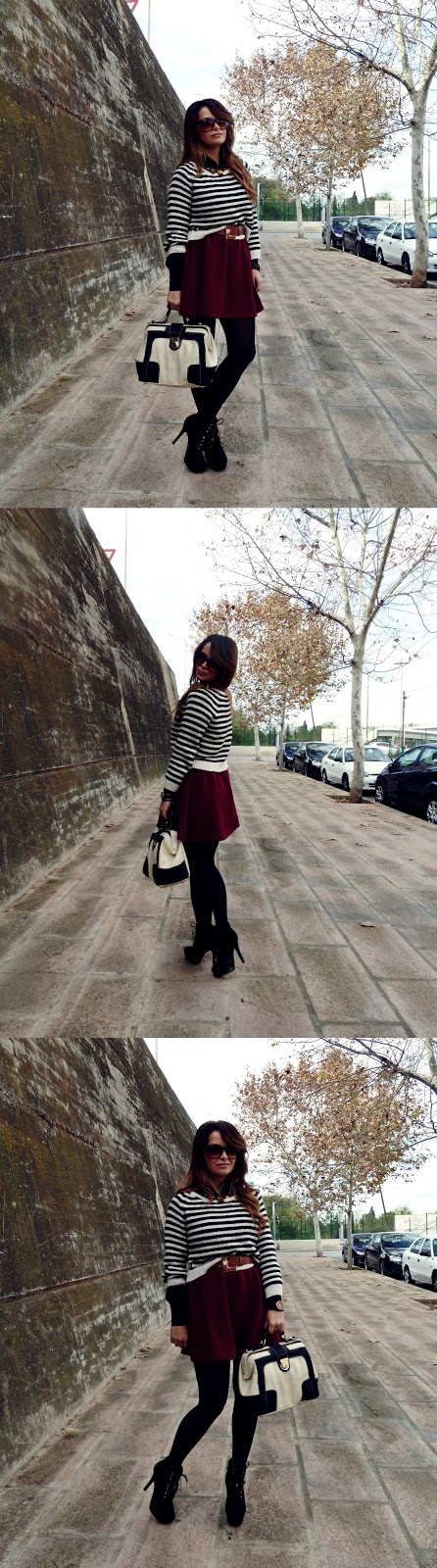 Una de las últimas tendencias en llegar a las tiendas: PRINT RAYAS. He mezclado un jersey que adquirí a principio de temporada con este estampado de una forma con la que lo suelo hacer bastante a menudo: negro&burdeos.