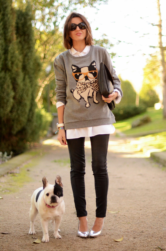 Y es que esta temporada las sudaderas no vienen solas, llegan acompañadas de perlas, strass, oro,  lentejuelas… cosidas sobre ellas o en forma de complementos como lo luce Miroslava.