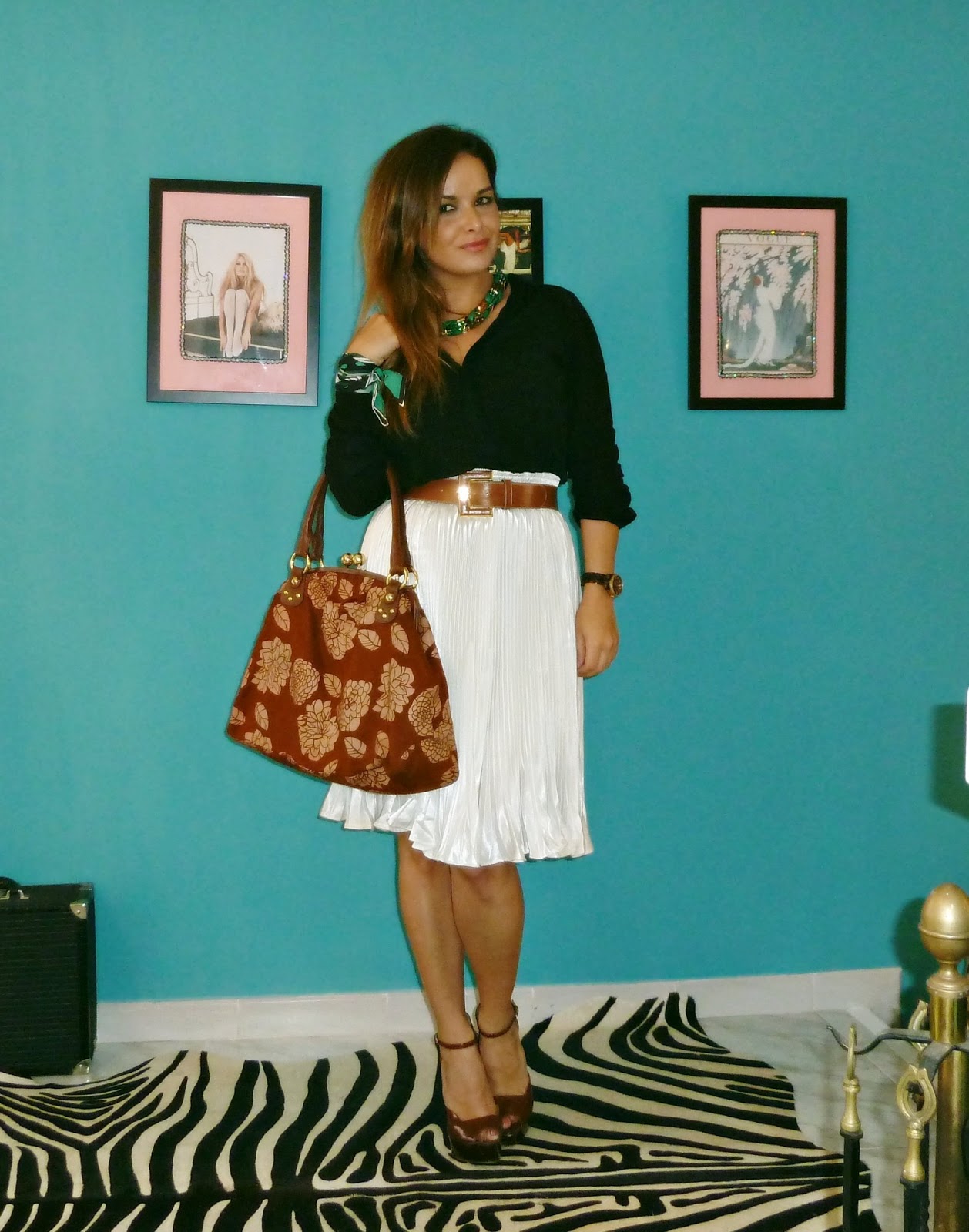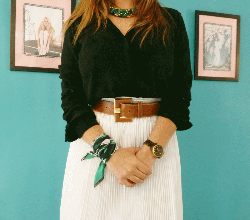 Para que el look no resultara demasiado sobrio, lo he combinado con complementos en color cuero (calzado, cinturón y bolso) y verde (collar y pañuelo en muñeca)